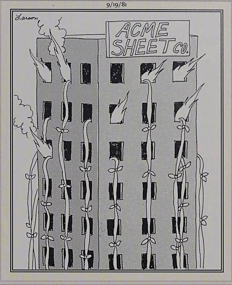 Este Lado lejano El cómic tiene la sensación de un clásico Simpsons Gag Cutway, en el que el espectáculo se aparta de la acción principal para meter en una broma ridícula de la barra lateral. Aquí, el “Acme sheet compañía“El edificio se ha incendiado, pero afortunadamente, Su producto permite un medio rápido de escape para los empleados en los niveles superiores del edificio de gran altura.