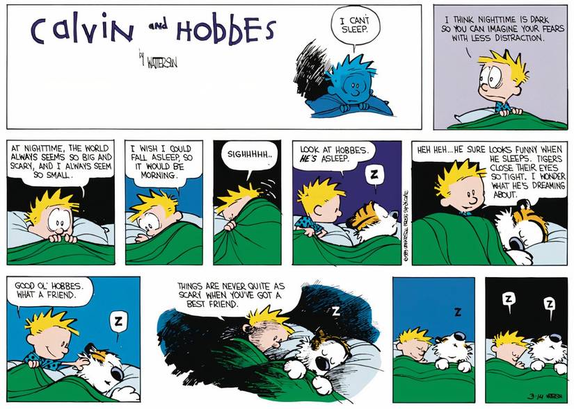 Calvin y Hobbes están acostados en la cama juntos (como lo hacen todas las noches), pero algo está mal: Calvin no puede dormir. Calvin se sienta, incapaz de mentir más. Pero cuando lo hace, Calvin comienza a asustarse por la oscuridad a su alrededor. Admite que, por la noche, el mundo parece tan grande y aterrador mientras se siente tan pequeño. En otras palabras, Calvin tiene miedo de la oscuridady el hecho de que no puede dormir solo lo empeora. Pero entonces, Calvin mira a Hobbes, suena dormido, e inmediatamente deja de tener miedo.