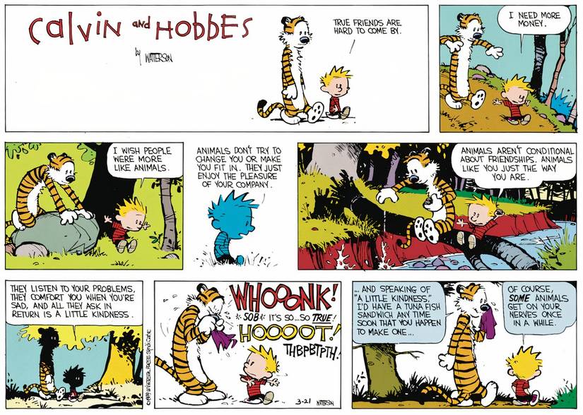 Calvin y Hobbes están caminando por el bosque detrás de la casa de Calvin un día, deambulando sin rumbo, disfrutando del clima agradable y la compañía de los demás. Durante su paseo, Calvin comienza a hablar sobre cómo los animales hacen mejores amigos que las personas. Él dice que los animales no intentan cambiar a sus amigos, y que los animales de amor dan es incondicional (a diferencia de las personas). Calvin básicamente dice que aprecia a Hobbesy está contento de que sean mejores amigos. Al menos, algunas veces, cuando Hobbes le sopla la nariz y le pide a Calvin un sándwich de pescado de atún justo en ese momento.