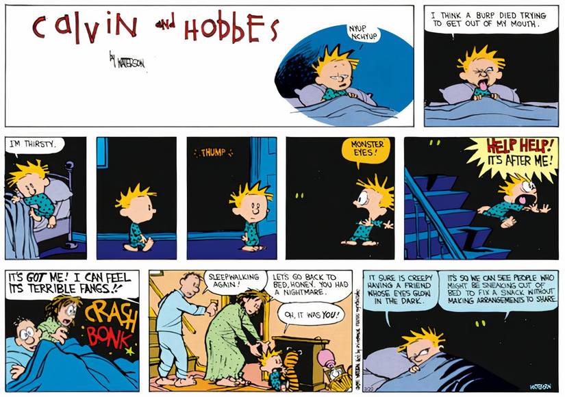 Calvin se despierta en medio de la noche porque tiene sed, por lo que se levanta de la cama y se dirige a la cocina para tomar un vaso de algo de beber. Sin embargo, en su camino a la cocina, Calvin se encuentra con lo que él cree que es un monstruo que acecha en la oscuridad. Todo lo que ve son dos ojos brillantes en la oscuridad, y Calvin se asusta tanto que huye gritando. Los padres de Calvin lo escuchan gritar y encender la luz para verlo, lo que revela que El ‘monstruo’ que Calvin tenía miedo era en realidad solo Hobbes.