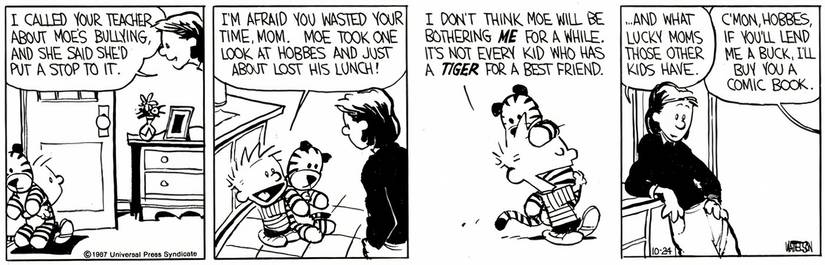 Mientras Calvin camina a casa desde la escuela con Hobbes (que, en esta tira cómica, se representa como un animal de peluche), la madre de Calvin los detiene. Ella le dice a Calvin que acaba de recibir una llamada de la escuela sobre uno de los compañeros de clase de Calvin llamado Moe, que ha estado intimidando a Calvin. La madre de Calvin dice que su maestra le aseguró que lo detenía, pero Calvin dice que eso no es necesario. Aparentemente, Moe echó un vistazo a Hobbes y se aterrorizó tanto que decidió dejar a Calvin solo.