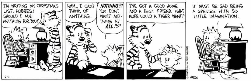 Calvin está trabajando en su carta a Santa cuando se acerca a Hobbes. Calvin le pregunta a Hobbes si puede agregarle algo a la carta, ya que los tigres no pueden escribir cartas a Santa, solo los niños pequeños pueden (todos lo saben). Pero, para sorpresa de Calvin, Hobbes no podía pensar en una sola cosa que quisiera. Calvin no puede creerlo, preguntándole a Hobbes si realmente ni siquiera hay una cosa que él quisiera. Hobbes asegura a Calvin que no lo hay, diciendo que tiene un buen hogar y un mejor amigoentonces tiene todo lo que podría desear.