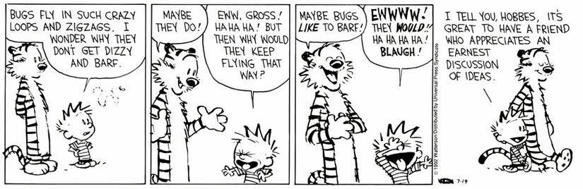 Calvin y Hobbes están viendo a una mosca zumbar, y Calvin dice que si ese fuera él, él fuera barf. Hobbes dice que tal vez la mosca hace barf, y la razón por la que sigue volando es que le gusta el barfing. Calvin se rompe riéndose de la idea de eso, y también lo hace Hobbes inmediatamente después de que lo dijo. Unos momentos después, Calvin le dice a Hobbes cuánto aprecia su “Discusión sincera de las ideas” – Como si estuvieran hablando de algo importante, no un bug Puke.