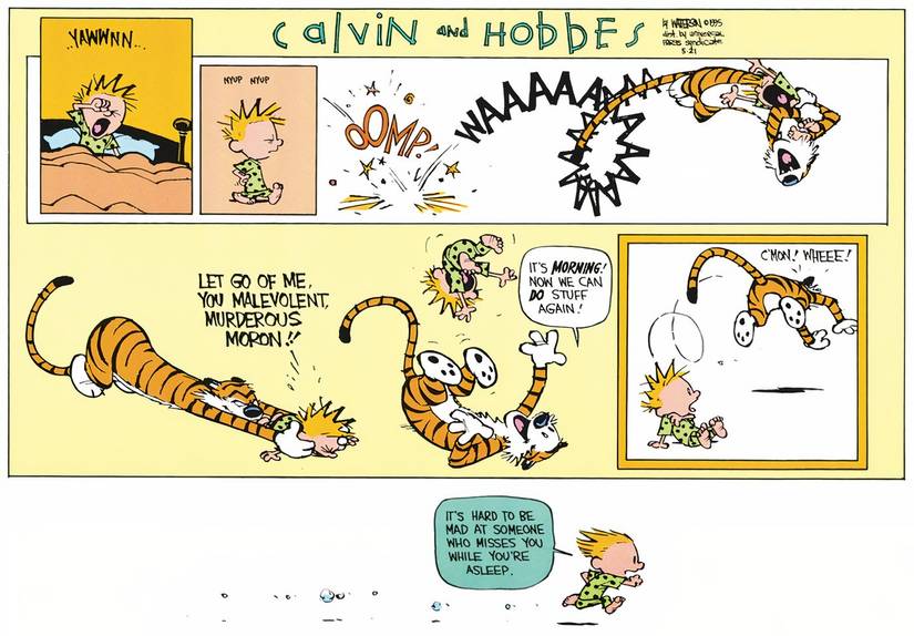 En el momento en que Calvin está despierto en esta mañana en particular, es atacado inmediatamente por Hobbesque evidentemente ha estado despierto durante horas esperando que Calvin se despierte para que puedan comenzar su día y jugar juntos. Hobbes aborda a Calvin hasta el suelo, lo que resulta en una pelea momentánea, antes de que Calvin logre escapar y huir. Al principio, Calvin está molesto por Hobbes, ya que el tigre no esperó un segundo antes de atacarlo. Pero entonces, Calvin se da cuenta de lo afortunado que es tener un mejor amigo que está tan emocionado de jugar con él.
