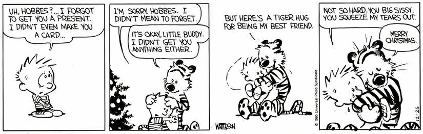 Un año durante la Navidad, Calvin se olvida de que Hobbes sea un regalo. Cuando se hace demasiado tarde para conseguirle algo, Calvin se acerca a Hobbes y admite lo mal que se siente, llamándose un mal amigo por olvidar que Hobbes es un regalo de Navidad. Sin embargo, como los lectores saben de una franja cómica anterior de Calvin y Hobbes, Hobbes no quiere nada para Navidad, ya que es feliz solo ser mejor amigo de Calvin – Y Hobbes le dice a Calvin que nuevamente en este cómic.