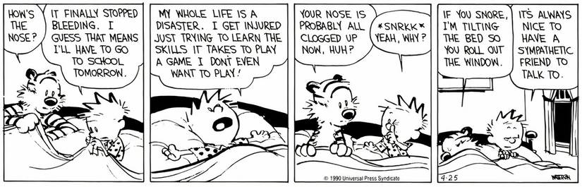 Calvin se está recuperando de un sangrado de la nariz una mañana, pero todavía se ha detenido. Pero, en lugar de comprender la situación de Calvin, Hobbes amenaza a Calvin, diciendo que si su nariz congestionada lo hace roncar, lo tirará de su cama. A decir verdad, este cómic hace un mejor trabajo al destacar la amistad de Calvin y Hobbes que un cómic donde son dulces, ya que ser un poco malo con los amigos (especialmente los amigos de la infancia) es un verdadero signo de amistad.