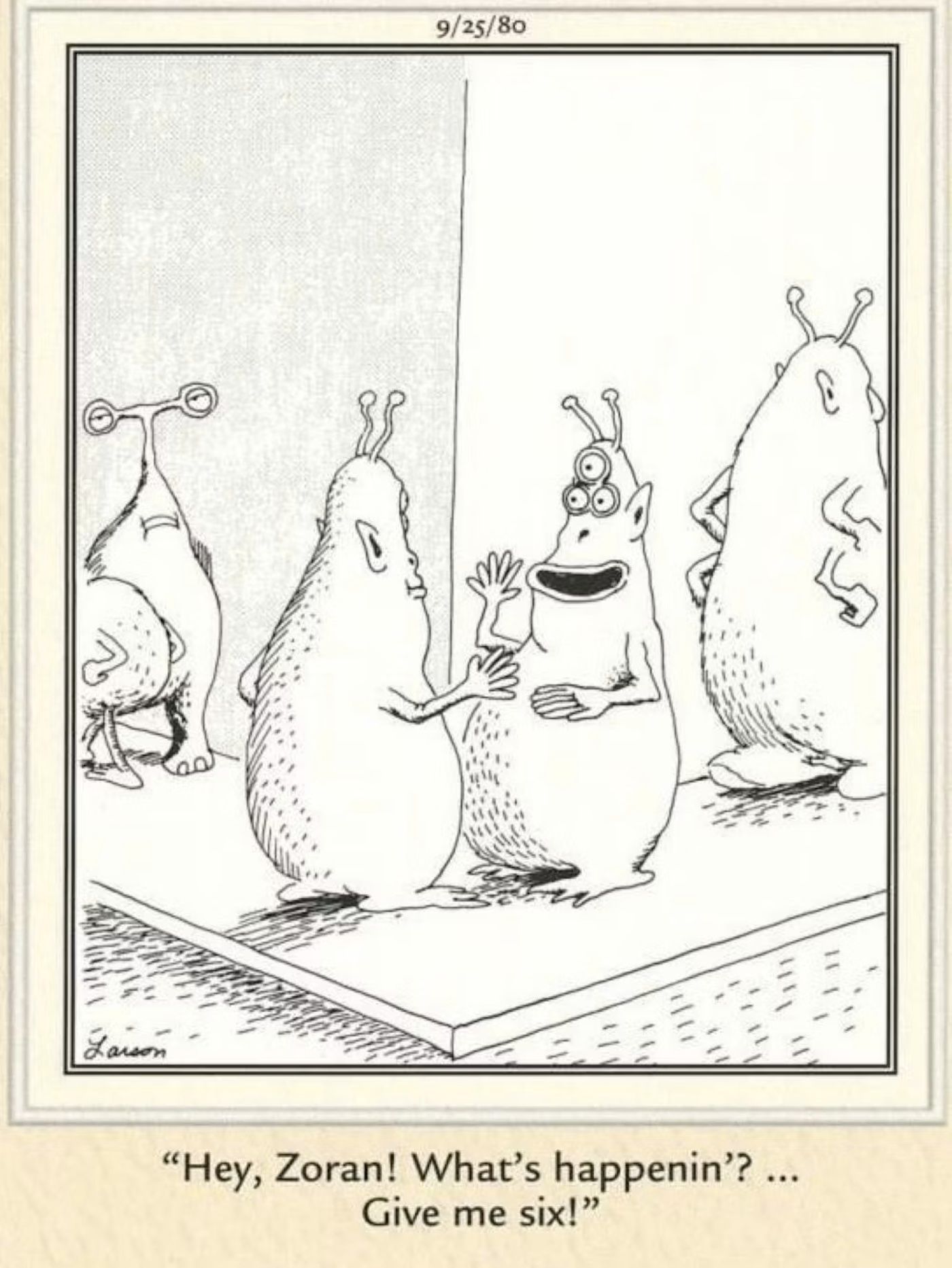 “/> En lo que puede ser uno de los más tontos Lado lejano En los cómics, un extraterrestre se encuentra con su amigo, Zoran, en la calle por casualidad y, en lugar de la habitual bofetada de cinco dedos, solicita seis. Dado que esta especie particular de extraterrestre tiene manos con seis dígitos en lugar de cinco, esta sería, por supuesto, la norma para ellos. Ergo, el humor viene con su yuxtaposición al habitual saludo de “choca esos cinco” entre amigos. Eso es literalmente todo lo que hay en el chiste. Es una declaración tácita que contradice una cursilería casi abrumadora..