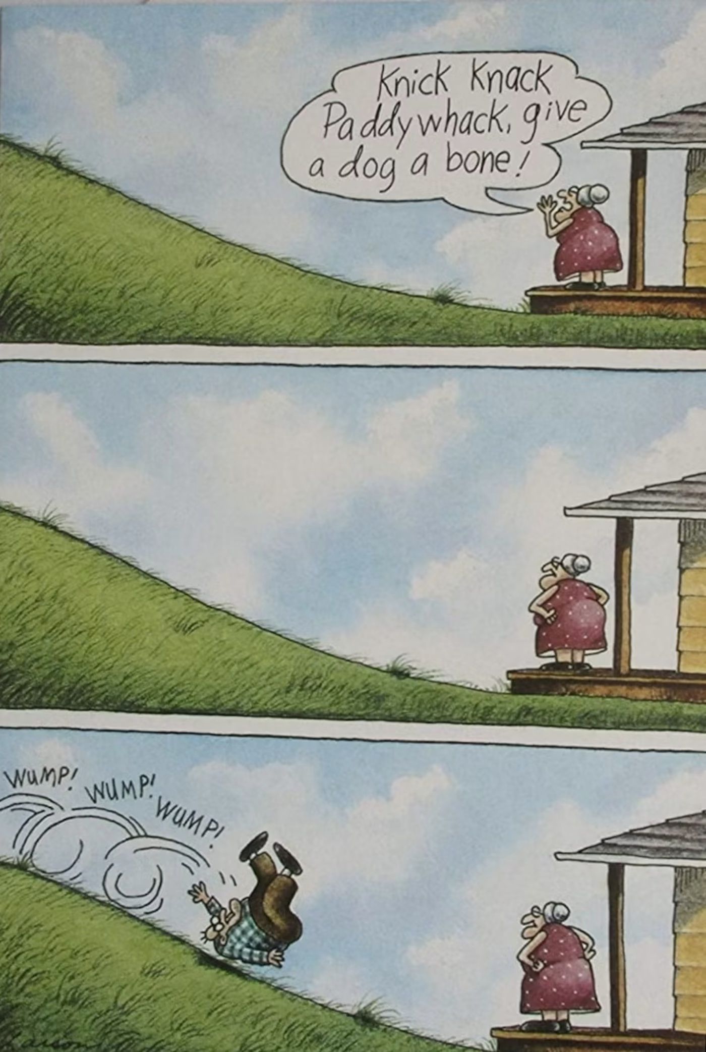 “/> En referencia a la vieja canción infantil, “This Old Man”, una anciana grita la famosa línea de la canción y es recibida por la vista de su esposo cayendo colina abajo a su entera disposición. Quizás la recitación de la letra que convoca a su descarriado cónyuge a cenar en casa sea algún tipo de habilidad mágica de su parte. El chiste adquiere un humor tonto de una magnitud asombrosa debido a la sencillez de la recompensa. Después de todo, ¿qué joven no se rió de la pura tontería de imaginarse a un anciano rodando colina abajo cuando aprendieron la rima por primera vez?