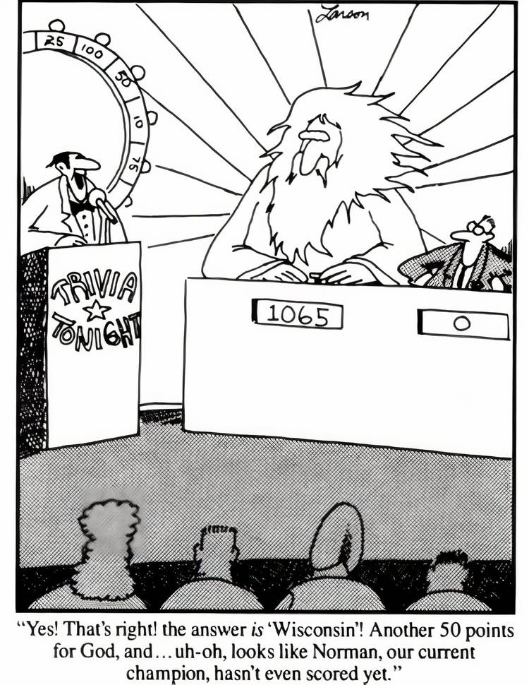 Muchas teologías diferentes enseñan que Dios es el creador omnisciente del universo y, dado que Él lo sabe todo, ganar un concurso es pan comido para el Todopoderoso. De hecho, el campeón anterior, Norman, ni siquiera es capaz de sumar un solo punto mientras compite contra Dios, lo cual es un giro hilarante de la naturaleza omnisciente de Dios.