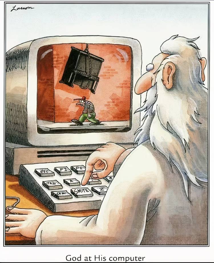 Es extraño ver a Dios usando una computadora para golpear a la gente, ya que uno pensaría que la naturaleza misma de Su poder divino sería suficiente para realizar el trabajo.. Pero, como confirma The Far Side, ese no es el caso, ya que el golpe de Dios es sorprendentemente de alta tecnología.