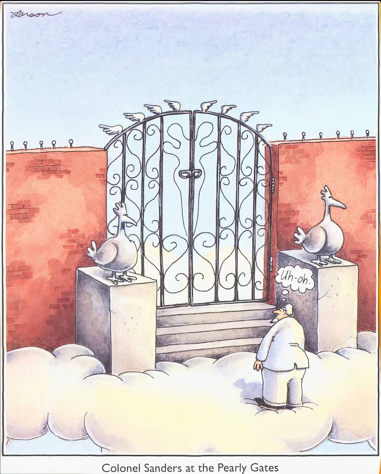 Este Lado lejano El cómic muestra al coronel Sanders, el fundador de Kentucky Fried Chicken, de pie ante Pearly Gates. Desafortunadamente, las cosas no parecen muy ideales para el fundador de KFC, ya que parece que el creador del universo es una especie de pollo divino en lugar de un anciano con barba blanca. Dado que el coronel Sanders es directamente responsable de la muerte de innumerables pollos, se ha encontrado en una situación bastante incómoda, en la que estará por toda la eternidad. El otro lado.