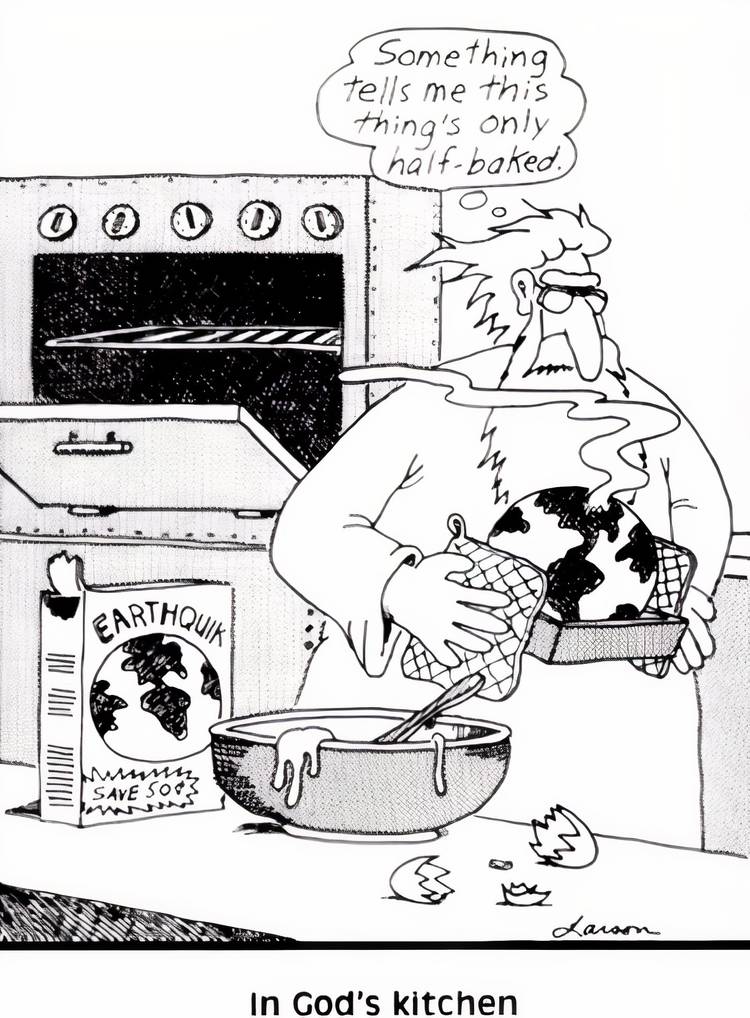 Mientras que el cómic anterior de Far Side mostraba a Dios dando los toques finales a la Tierra antes de que se completara el proceso de creación.este cómic muestra la creación misma de la Tierra y se mantiene fiel al paralelo establecido de la “cocina”. Dios está sacando la Tierra de un horno gigante después de batirla en un recipiente con ‘Earthquik’ (como si Dios hubiera comprado los ingredientes para crear un planeta en su supermercado local). Esta es sin duda una interesante reimaginación de la Historia de la Creación, una que es infinitamente más tonta.