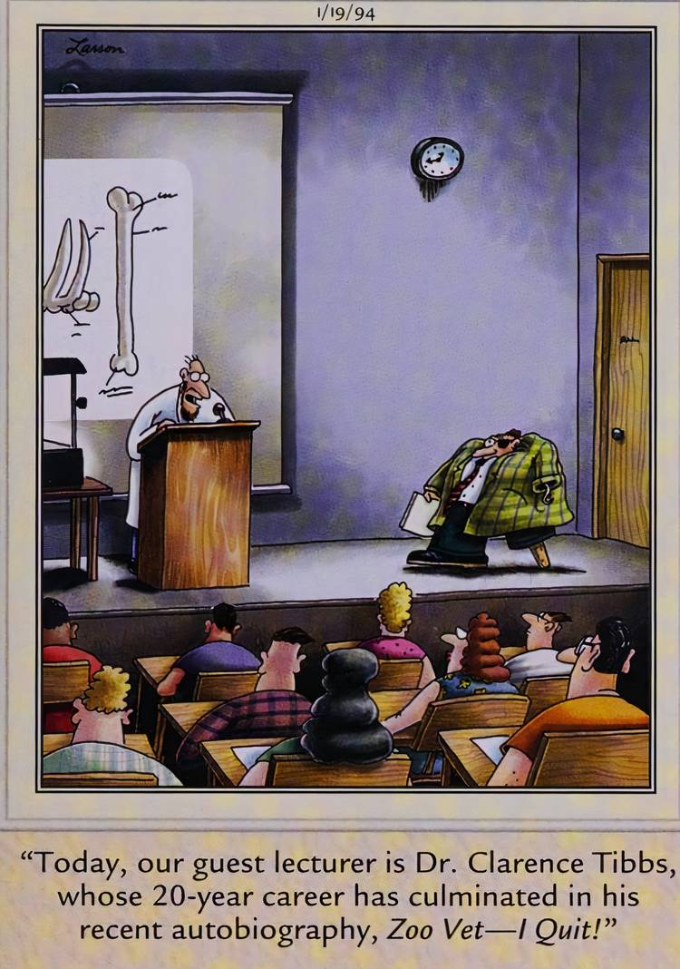 Una vez más, Gary Larson utiliza el zoológico como parte del chiste, aunque en este caso, como parte del montaje del chiste, más que como remate. El panel presenta a un profesor. dando la bienvenida a la clase “conferenciante invitado“por el día”,Dr. Clarence Tibbs“, explicando que está allí para discutir su autobiografía “Veterinario del zoológico – ¡Renuncio!“