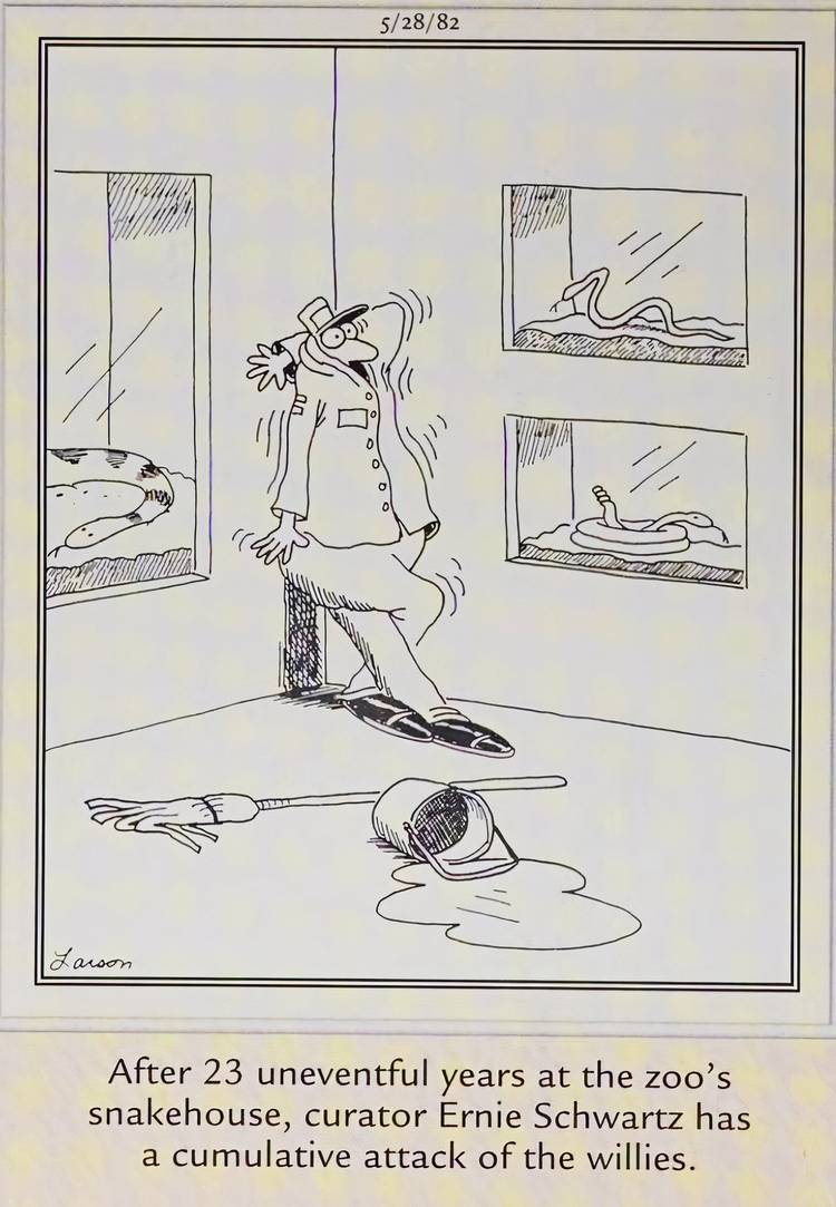 Las serpientes eran las favoritas de Gary Larson, y hacían frecuentes Lado lejano apariencias, siendo éste particularmente divertido tanto a nivel de su premisa como de su ejecución. Visualmente, la ilustración de Ernie presa de una avalancha de miedo es sorprendentemente divertida, mientras que conceptualmente, la idea de ser repentinamente golpeado por décadas de un “acumulativo” El sentimiento – especialmente el miedo – es evocador. Larson extrae efectivamente el humor aquí, gracias en gran parte a “casa de serpientes“escenario, ya que muchos lectores se identificarán con el de Ernie”pelos de punta“.