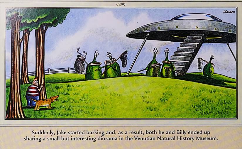 Si bien muchos de los chistes de Gary Larson sobre los museos se burlan de los museos en general, éste resalta una parte específica de la experiencia del museo, es decir, acercarse demasiado a la exhibición, ya sea intencional o inadvertidamente. Al convertir a los personajes aquí en perros, que se quedan asombrados mientras contemplan “el palo perfecto“, Larson ofrece una interpretación perfecta de esta experiencia, deformada a través de su filtro característico.