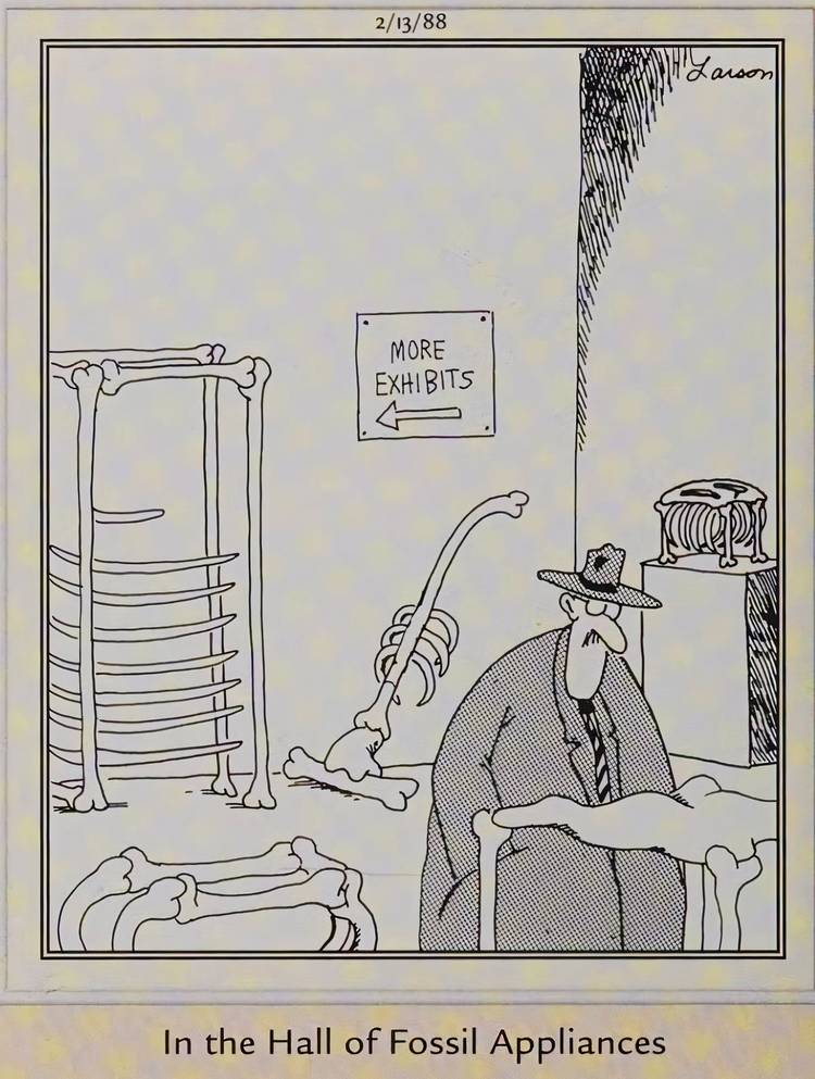 En uno de los más extraños Lado lejano paneles de 1988, Gary Larson representa “el Salón de los Electrodomésticos Fósiles“, una vez más presentando a uno de El lado lejano muchos hombres vestidos con gabardinas mientras él observa el esqueleto de un televisor, con los huesos de un refrigerador y una aspiradora contra la pared opuesta detrás de él.