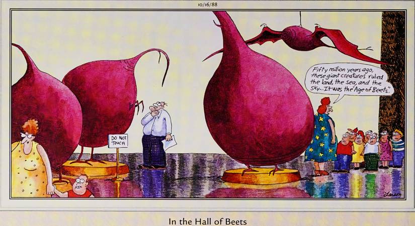 Subtitulado, “En el salón de las remolachas,” este francamente surrealista Lado lejano La caricatura presenta un museo que sustituye enormes remolachas por esqueletos de dinosaurios, mientras una profesora recorre con sus alumnos las enormes verduras y les explica que “Hace cincuenta millones de años, estas criaturas gigantes dominaban la tierra, el mar y el cielo… era la “Era de los Beats”.“.