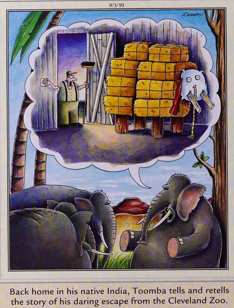 Los elefantes eran una vista común en El otro ladoy aquí, Gary Larson imagina un paquidermo que cuenta su elaborado plan para escapar del zoológico de Cleveland y regresar a “su India natal“, que milagrosamente logró. Una vez más, Larson hace un chiste muy eficaz sobre un zoológico, sin utilizarlo como ubicación principal del chiste.