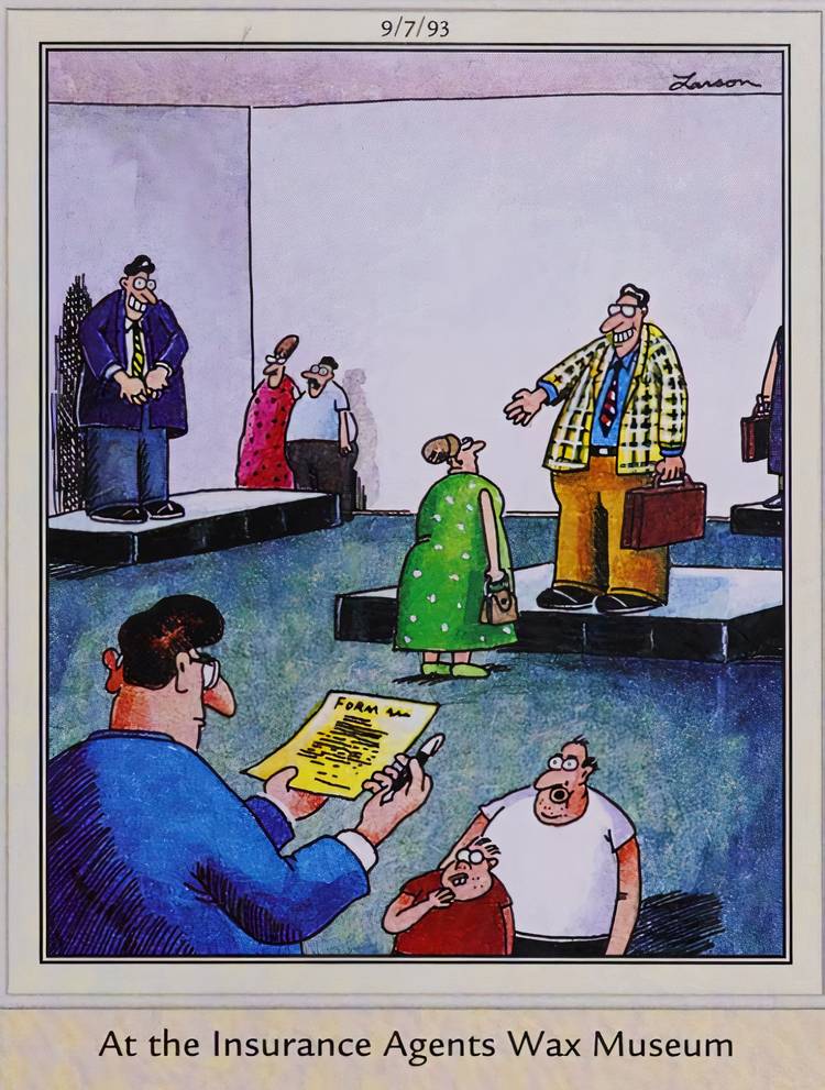 Este Lado lejano caricatura, ambientada en el “Museo de Cera del Agente de Seguros,” aparentemente deriva de la idea de un museo dedicado a lo ordinario, más que a lo excepcional. Con varias personas mirando boquiabiertas figuras de hombres sosteniendo formularios y maletines.el verdadero humor de este panel, como muchas ilustraciones de Gary Larson, está contenido en las expresiones faciales de los asistentes al museo.
