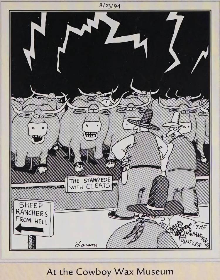 En este panel, Gary Larson revisa la premisa del “Museo de Cera” y ofrece una encarnación aún más divertida del chiste, esta vez en el “Museo de Cera del Vaquero,” como dos personajes del Lejano Oestepararse frente a “la estampida con tacos“, que muestra un rebaño de vacas con zapatos con púas corriendo hacia adelante contra un cielo lleno de relámpagos.
