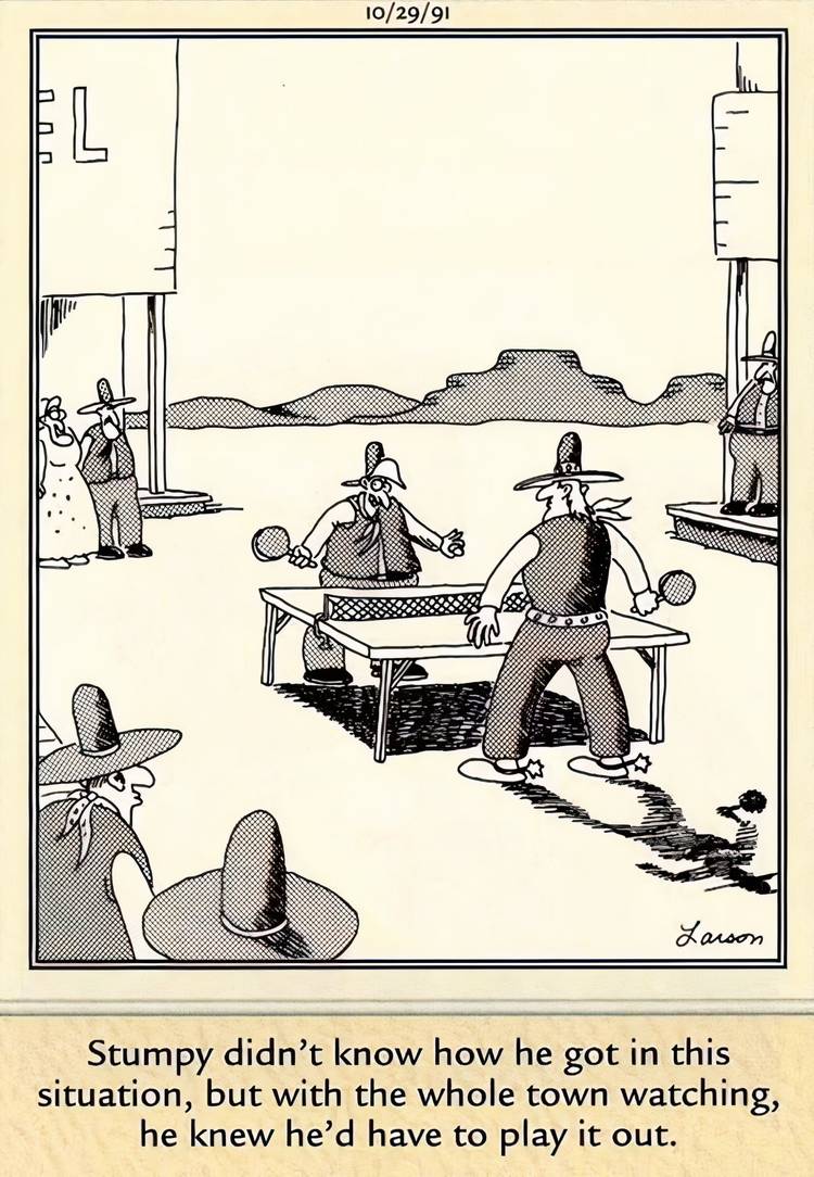 Dos vaqueros se enfrentan en medio de su pueblo al estilo clásico del ‘duelo al mediodía’. Excepto que esta versión es un poco diferente. En lugar de dos pistoleros participando en un juego mortal de habilidad y azar con sus confiables pistolas, Estos dos vaqueros van a resolver sus diferencias con una partida de ping-pong.. Si bien el tenis de mesa es decididamente menos serio que un duelo, estos vaqueros parecen tomárselo igual de en serio (incluso si el viejo Stumpy parece un poco confundido).