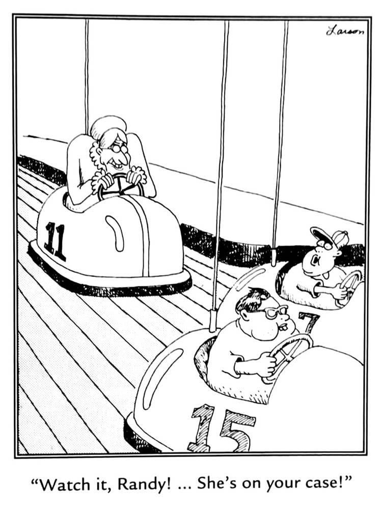 Es divertido ver a la mujer meterse tanto en los autos de parachoques, pero tal vez se metió un poco también, asustando a los dos niños con su pasión. Al ver la expresión de alegría traviesa en la cara de la mujer, los dos niños saben que tienen serios problemas. Aquí, Gary Larson celebra la libertad que viene con la vejez.