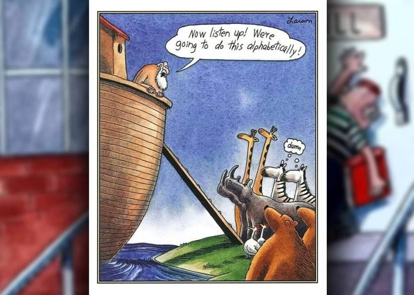 Gary Larson trae de vuelta la parábola del arca de Noé para proporcionar más contexto para el viaje del personaje bíblico. Como muchos saben, Noé trajo animales de todas las especies a su arca para que pudieran ser preservados para el futuro. En este cómic, él llama a los animales, “¡Vamos a hacer esto alfabéticamente!” La mayoría de ellos no parecen molestos por esta regla, pero las cebras se maldigen para sí mismas.