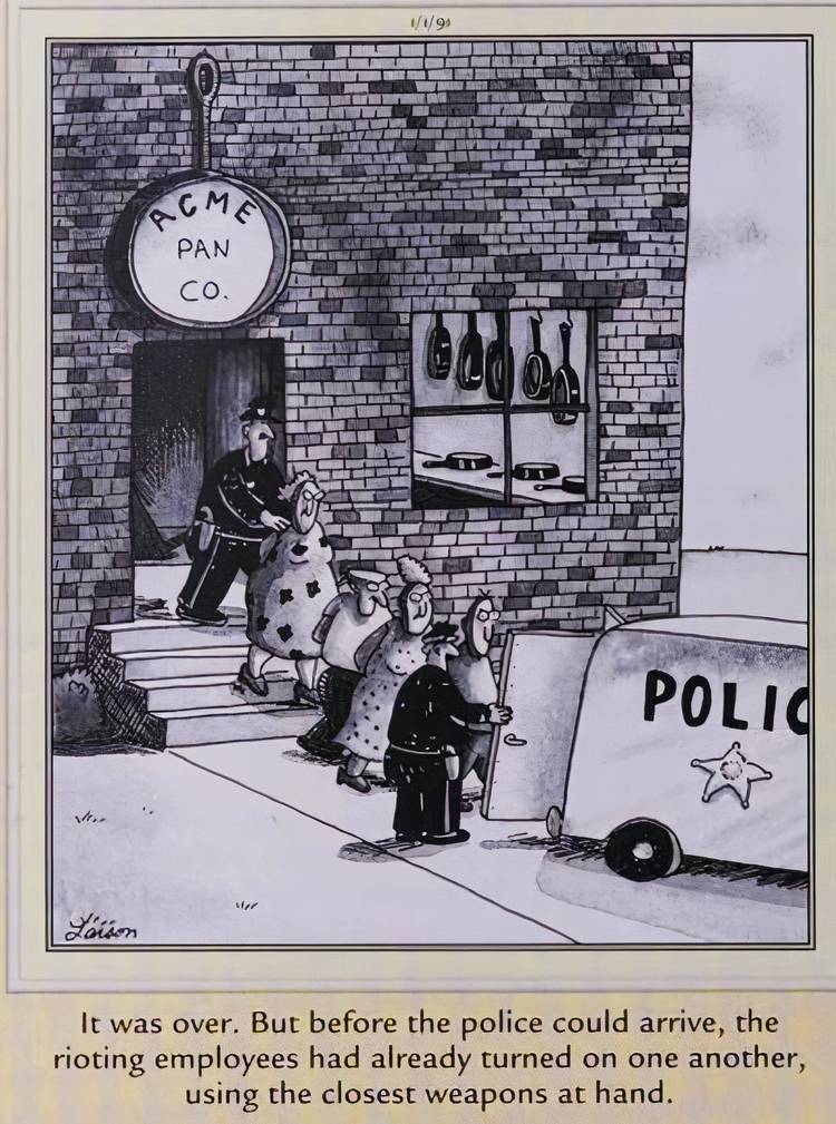 De todos El lado lejano Tiras que ponen disturbios en un centro de atención, esta es una que en realidad muestra las consecuencias. La policía ha venido y arrestó a los trabajadores de Acme Pan Co., llevándolos al carro para llevarlos a la estación. El subtítulo debajo de la caricatura señala que los trabajadores usaron las armas más cercanas que tenían a mano, que obviamente son sartenes, un elemento básico de violencia cómica y de dibujos animados. Es esa fusión inteligente de tropos familiares con consecuencias del mundo real lo que hace este Lado lejano Soltee un excelente ejemplo del sentido del humor único y hilarante de Larson.
