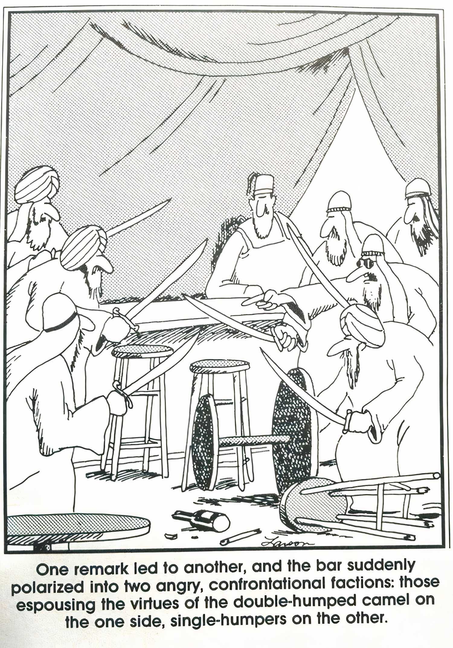 Un hecho de la vida es que las personas no están de acuerdo, y un hecho aún más triste es que esos desacuerdos a menudo conducen a la confrontación y un brote de violencia. Este Lado lejano sTrip ve a los clientes de un bar a un cabello lejos de una pelea total con espadas. Pero, ¿qué hizo que los hombres se indiquen lo suficiente como para matarse? Aparentemente, un camello de una sola joroba es mejor que un camello de doble joroba. Es absolutamente ridículo (como la mayoría Lado lejano Los escenarios son)pero Larson clava la tendencia de las personas a saltar a la violencia sobre los sujetos más inanidos. Honestamente, las peleas de bar se han producido sobre un tema más extraño.