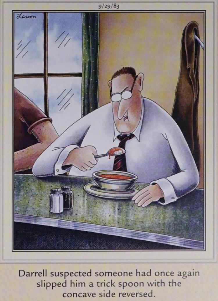 El lado lejano No tiene mucha fe en la humanidad, a menudo retratando a las personas como increíblemente ingenuas en el mejor de los casos o ignorantes más allá de la creencia en el peor. En esta franja, un hombre intenta comer sopa, solo para sospechar que alguien lo engañó dándole una cuchara novedosa con el lado cóncavo invertido.