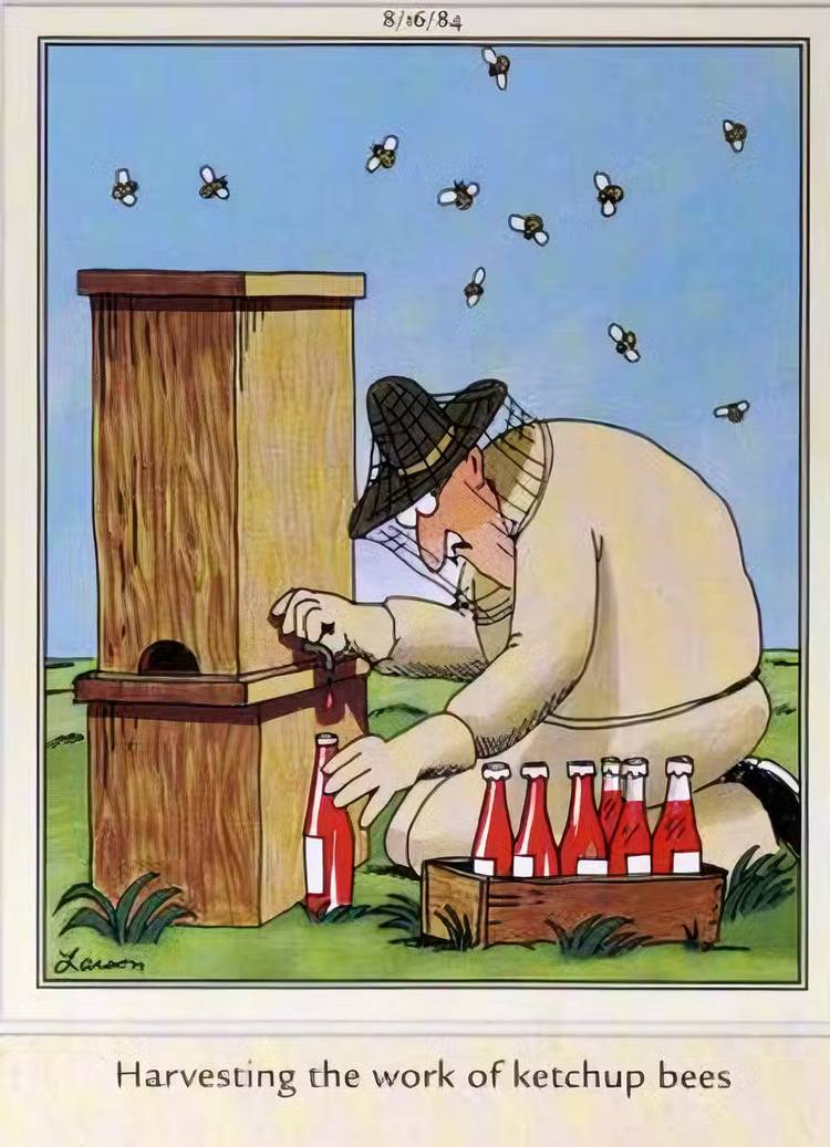 Aquí, un apicultor está abriendo una de sus colmenas para cosechar el arduo trabajo de sus abejas. Sin embargo, en lugar de miel, este apiarista recoge ketchup de sus abejas. ¿Por qué sus abejas hacen ketchup? Quién sabe, no hay nada en este cómic que indique por qué. Honestamente, hubiéramos esperado que se represente una granja de tomate cercana o posiblemente un restaurante, pero no hay nada. En cambio, es solo un hombre y sus abejas productoras de ketchup. Una vez más, nos hemos encontrado con otro Lado lejano Comic que parece ser absurdo por el bien, desprovisto de cualquier sátira o un frase clara por el que el trabajo de Gary Larson es conocido. Este podría ser un raro ejemplo de que Gary Larson se quede sin ideas.