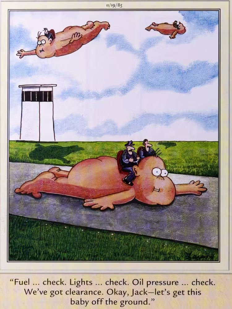 Muy bien, este finalmente puede ser uno de los más confusos Lado lejano cómics que entendemos. Aquí, un par de pilotos se sientan sobre un bebé masivo y desnudo mientras pasan por todos los controles previos a la luz. Mientras tanto, otros dos bebés gigantescos se ven volando en el fondo como dicen los pilotos originales “Vamos a despegar a este bebé”. Claramente, Larson se burla de nuestro hábito colectivo de llamar a los objetos (especialmente los vehículos) “bebé”, Pero estamos luchando por descubrir por qué Gary Larson eligió ir en esta dirección. Por lo general, los cómics del artista son altamente identificables, por lo que hubiéramos esperado algo más universal, como un automóvil como el sustituto del vehículo. Sin embargo, tal vez los bebés voladores parecían más divertidos. ¿Qué opinas?