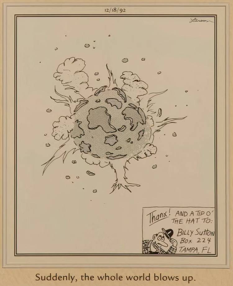 En este extrañamente perplejo Lado lejano Comic, el mundo ha explotado repentinamente. Eso es todo. Bueno, excepto por un mensaje personalizado a una persona llamada “Billy Sutton” en Tampa, Florida. Este cómic parece ser una excavación directa a una persona en particular que el dibujante no tiene rencor. O, tal vez, Gary Larson solo advierte el área de Tampa que nuestro mundo podría terminar en cualquier momento. Dicho esto, teniendo en cuenta el amor de Larson por la biología y el mundo natural, es muy probable que advierta a los lectores de los peligros que enfrenta nuestro planeta. Sin embargo, todavía no tenemos idea de quién es Billy Sutton o qué hizo para justificar Lo que parece una vaga amenaza de Gary Larson.