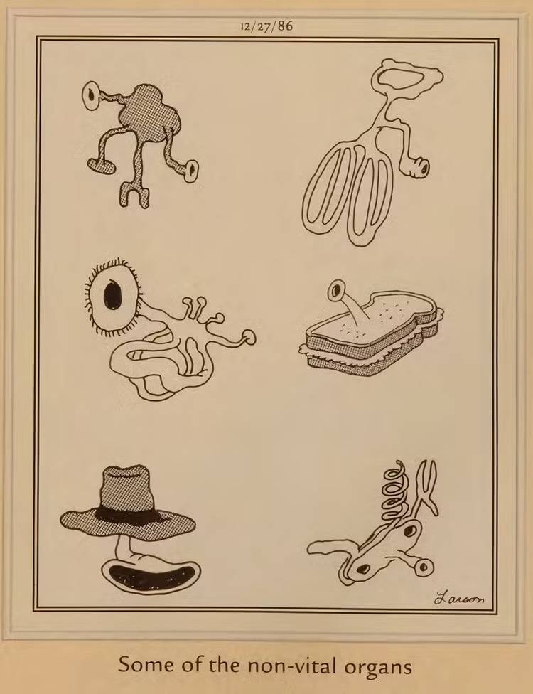 Nuestros cuerpos reciben muchas células y órganos especializados que trabajan juntos para seguir adelante. Sin embargo, según esto Lado lejano Comic, el cuerpo también contiene una variedad de órganos “no vitales”. Presentado, vemos una colección de órganos de aspecto confuso formados como objetos aleatorios, que incluyen un sombrero, una trompeta y un sándwich. Sin embargo, si quieres saber de qué se trata realmente este cómic, no tenemos ni idea en absoluto. El lado lejano a menudo es tan absurdo como referencial o satíricopero este cómic parece estar perdiendo los dos últimos. Es simplemente absurdo. Tal vez el dibujante simplemente se quedó sin ideas y esto fue lo mejor que pudo reunir ese día. Honestamente, estamos en una pérdida completa.