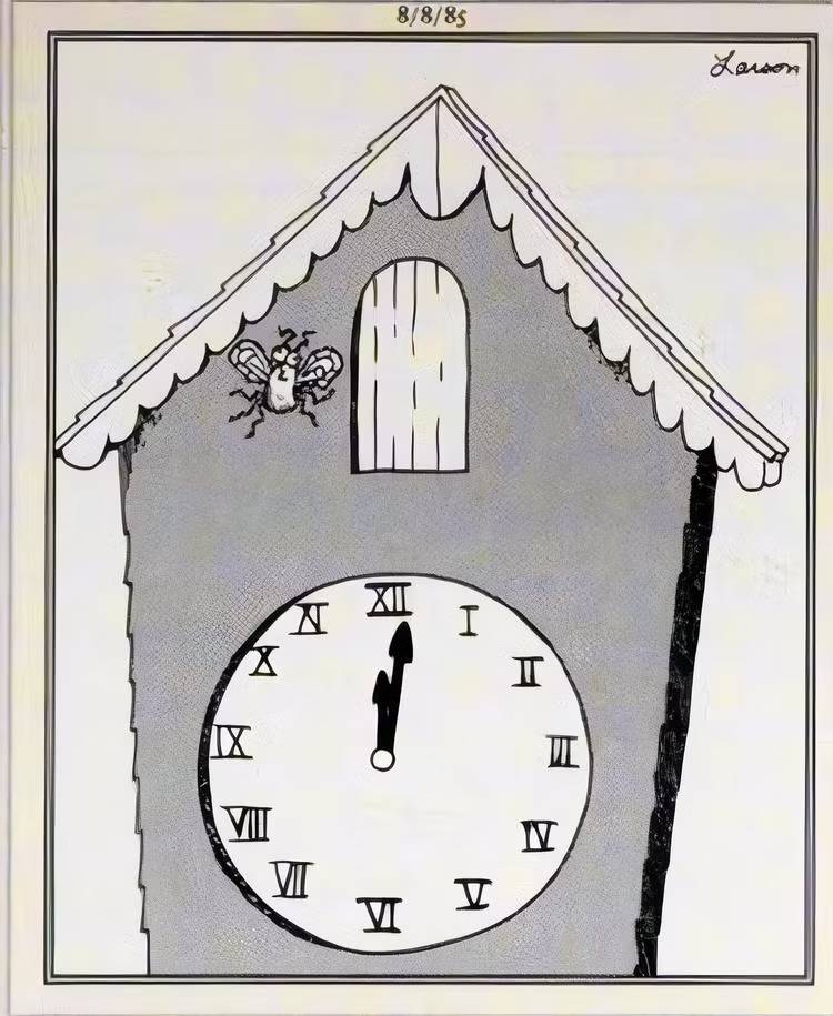No hay muchos Lado lejano Los cómics que no presentan una sola línea de texto, pero esta es una de ellas. En este cómic, vemos una mosca que acaba de estrellarse en el costado de un reloj de cuco, establecido un minuto después de la medianoche. No hay un subtítulo ni hay diálogo, solo la imagen tranquila de una mosca de ojos cruzadas y un reloj. Francamente, estamos en una pérdida completa con este cómic. Sin otro detalle para discernir lo que está sucediendo en esta escena, nuestra mejor suposición es que La mosca fue aplastada recientemente por la puerta del reloj del cuco. Sin embargo, todavía estamos luchando por encontrar el humor en la situación. ¿Qué crees que nos hemos perdido?