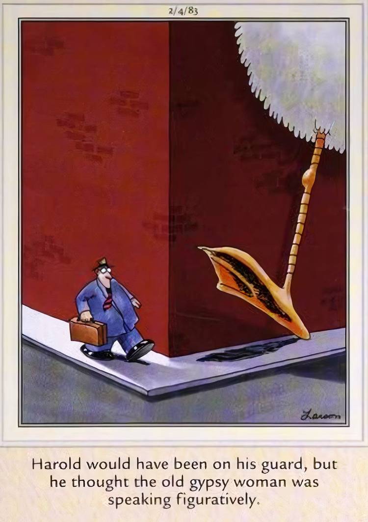 Ha habido un mito de larga data de que los viajeros romaníes poseen poderes fantásticos y frecuentemente maldecir a quienes los cruzan. En esto Lado lejano Panel, un hombre llamado Harold camina por la calle y cuando se acerca a una esquina, pronto se encuentra con un pájaro gigantesco como lectores de subtítulos “Harold habría estado en guardia, pero pensó que la vieja mujer gitana estaba hablando en sentido figurado”. Después de pensarlo durante demasiado tiempo para estar orgulloso, creemos que el cómic está haciendo referencia al idioma “hay algo grande a la vuelta de la esquina”, pero es difícil decirlo con certeza. Gary Larson frecuentemente se refirió a modismos en su trabajo, tomando frases comunes y retorciéndolas con su marca clásica de absurdo satírico.