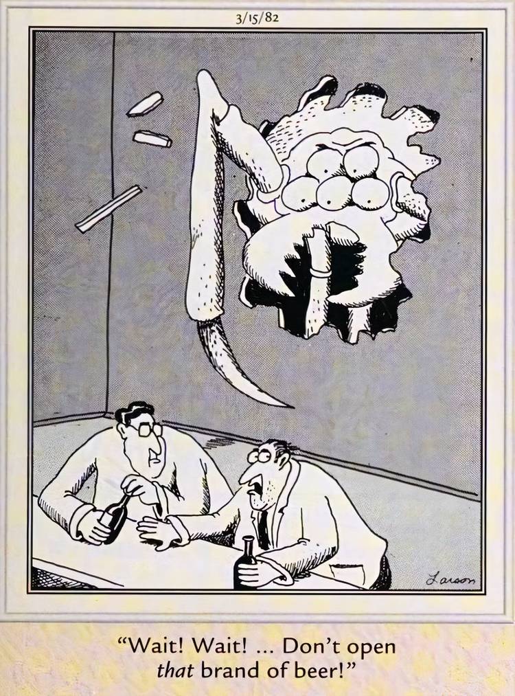 Disculpas a cualquier aracnófobos, pero aparentemente hay un tipo de cerveza que atrae a las arañas monstruosamente grandes y comidas por los hombres. En este cómic, dos hombres se preparan frenéticamente cuando un gigante de una araña estalla a través de la pared, como uno de los hombres exclama “¡Espera! ¡Espera! ¡No abra esa marca de cerveza!” Para evitar llamar a todos estos cómics puramente absurdos, existe una mayor posibilidad de que este cómic pueda estar haciendo referencia a algo. A Gary Larson le encantaba hacer referencia a la cultura popular en sus cómics Como él creía que haría su trabajo universalmente identificable. Sin embargo, no hay nada sobre esta tira que sea relatable; Es tan aterrador como confuso.