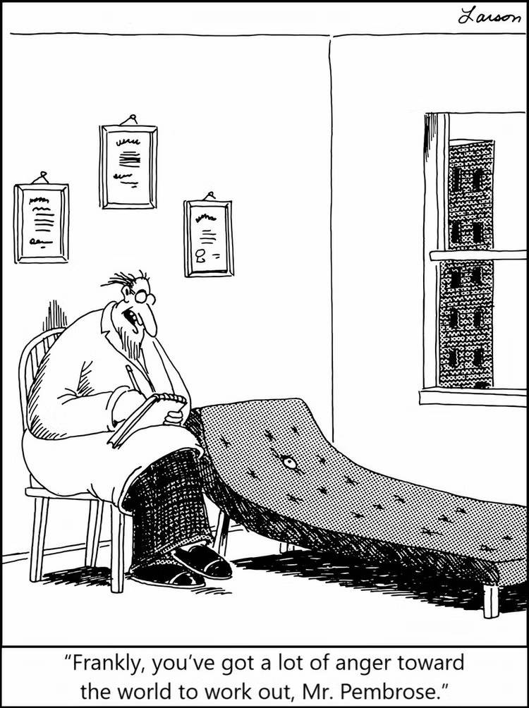 ¿No sería el mundo frustrante si solo fueras un ojo? Porque creemos que se supone que es la broma de este cómic, pero no estamos muy seguros. En este confuso Lado lejano Comic, un terapeuta mira a uno de sus pacientes que no es más que un ojo singular. A medida que el ojo se acuesta, simplemente mirando el techo, el médico le dice “Francamente, tienes mucha ira hacia el mundo para hacer ejercicio, Sr. Pembrose”. Es cierto que tratamos de buscar el nombre “Sr. Pembrose” para encontrar alguna pista, pero todo volvió a este cómic solo. Parece que No somos los únicos confundidos por este cómic confuso.