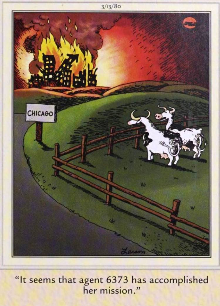 Mientras mucho de El lado lejano es su propio pequeño mundo absurdo, Larson ocasionalmente hace referencia a eventos o personas del mundo real Y aquí, toca el gran incendio de Chicago. Sin embargo, como es habitual para la franja, Larson tiene el incendio como resultado de una vaca que comienza intencionalmente para avanzar en algún tipo de agenda bovina. De acuerdo, la destrucción fue una tragedia, pero no se puede negar que ver una película sobre una vaca que se infiltra en Chicago con la intención de crear un gran desastre es algo que sería increíble ver como una película completa.