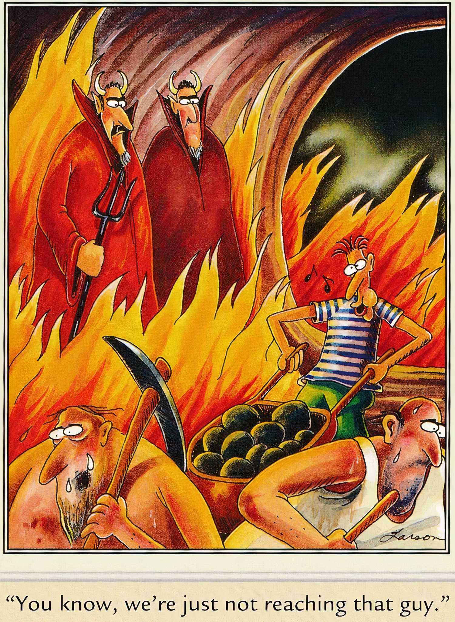 El lado lejano sobresale en la creación de escenarios ridículos y pocos son más tontos que este. Ubicado en el infierno (la gente del infierno, es decir), dos demonios están observando a las malditas almas que trabajan en el inframundo cuando notan que un hombre está pasando bien. Aparentemente, la condenación eterna y los fuegos del infierno no son suficientes para evitar que tenga una canción en su corazón mientras trabaja. Ahora, esa es una idea que merece un tratamiento cinematográfico, ver a un par de demonios que intentan (y casi seguro que falla) de romper el alma en el infierno que no se puede romper.