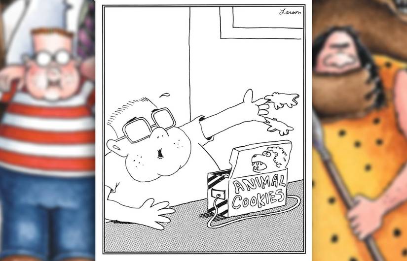 En este cómic, Las galletas de los animales luchan mientras el niño intenta comerlos, y se les muestra mordiéndose los dedos en represalia mientras reacciona en desconcierto. Cualquier niño que disfrute de galletas con forma de animales puede ver el humor aquí, lo que demuestra que los chistes de Larson pueden ser universales cuando quiere que sean.