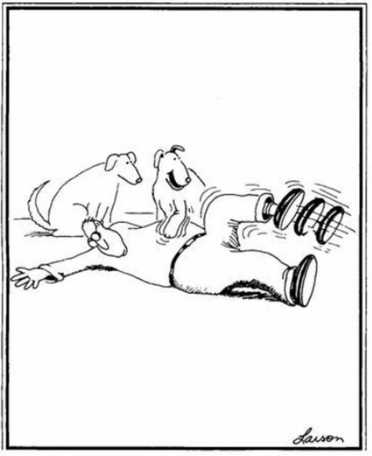 En este primer cómic, Larson no necesita una leyenda para transmitir la adorable broma que se presenta. La premisa aquí es bastante simple: Un perro rasca el vientre de su dueño, lo que le hace patearle la pierna. Como es típico de un Lado lejano Cartoon, la dinámica en juego entre humanos y animales se ha cambiado para que el perro se comporte de manera más humana y el humano demuestra un comportamiento similar a los animales.