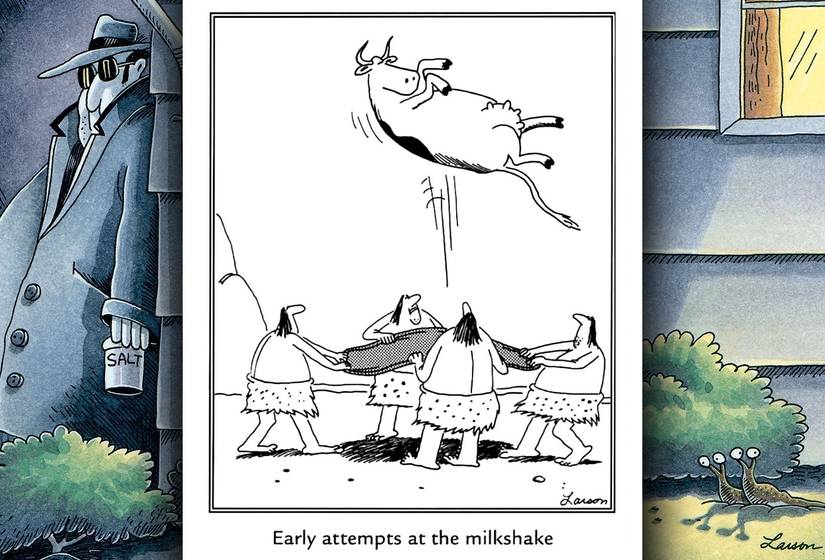 Este cómic es uno de muchos de El lado lejanoLa carrera histórica que presenta a los hombres de las cavernas, y estas tiras específicas tienen como objetivo “difamiliar” a la audiencia con los conceptos con los que están familiarizados al retratar cómo se descubrieron por primera vez hace siglos. Por ejemplo, estos hombres de las cavernas parecen estar arrojando una vaca al aire repetidamente. El subtítulo explica cuál es su intención con tirar a este pobre bovino: “Intentos tempranos en el batido”.