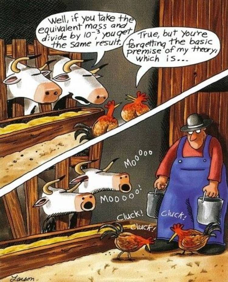 Este cómic también incluye vacas, ya que son un elemento básico del trabajo de Larson en El lado lejano. Estas vacas son más inteligentes que el animal promedio, y conversan con pollos en una granja. Sorprendentemente, su discusión se centra en la ciencia, y parecen estar participando en el discurso sobre las diferentes fórmulas y los descubrimientos en las actividades intelectuales. Mientras tanto, El agricultor revisando solo escucha sonidos de animales ininteligibles cuando escucha su charla.
