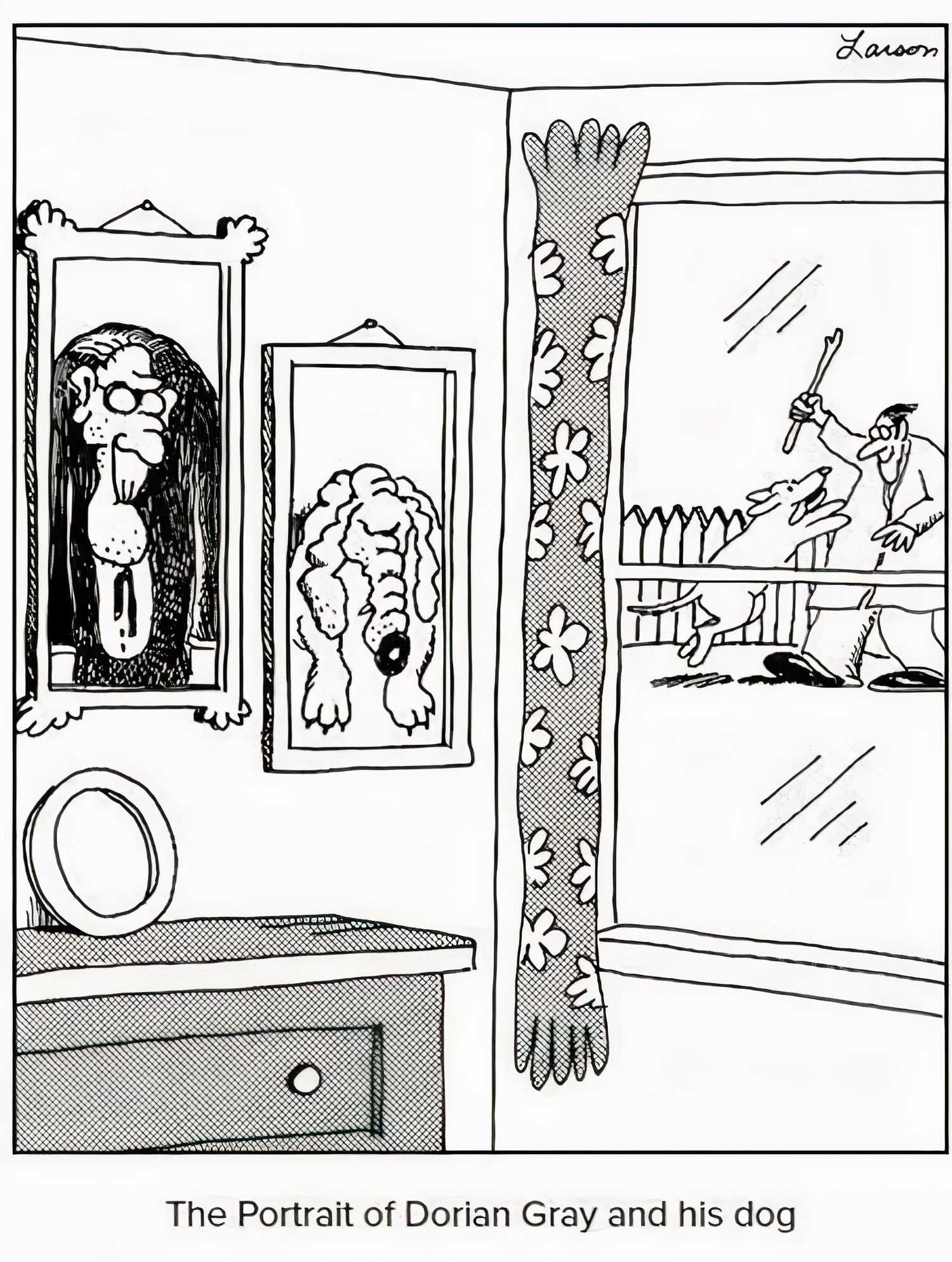 La imagen de Dorian Gray es una historia sobre el precio del tocador y la adhesión a los jóvenes y, aunque es una buena historia inquietante, Larson lo hace un poco más saludable y divertido con su enfoque poco convencional. Sí, todavía es Dorian Gray usando un retrato que envejece para que pueda permanecer eternamente joven. Pero a diferencia del libro, El lado lejano tiene gris incluye una pintura de su perro, que envejece de manera similar mientras los dos se desarrollan en el patio. No hace el mismo punto que la novela original, pero ¿qué dueño de mascotas no haría lo mismo?