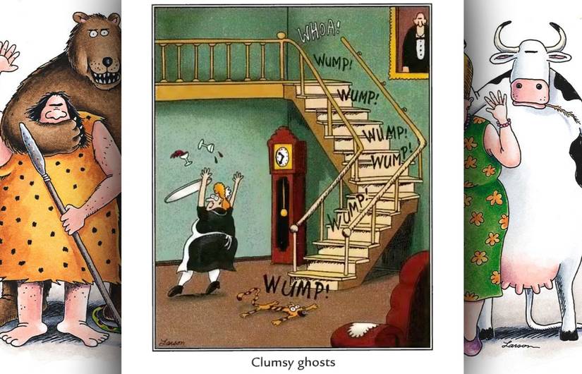 En el mundo de Gary Larson, incluso los personajes más salvajes viven mundanos, la vida cotidiana. Frankenstein e Igor Bicker, como una pareja de viejos casados, los elefantes de circo se quejan por su salario, y los terroríficos fantasmas son despertados en la noche por un accidente inexplicable. Afortunadamente por los espíritus en este cómic, solo su gato golpeaba una lámpara, aunque su alivio plantea la cuestión de lo que tenían miedo de encontrar. ¿El mundo de Lado lejano ¿Tiene fantasmas que persiguen a los fantasmas, o eso simplemente equivalería a un invitado de casa no deseado?