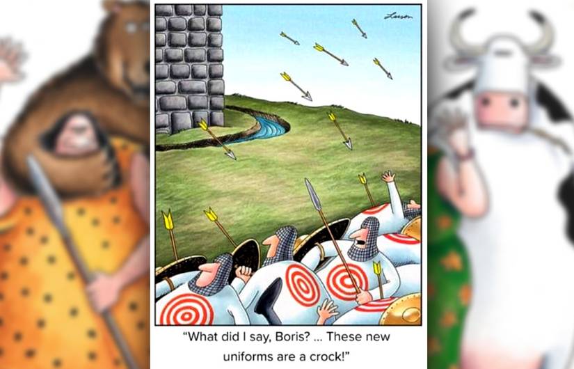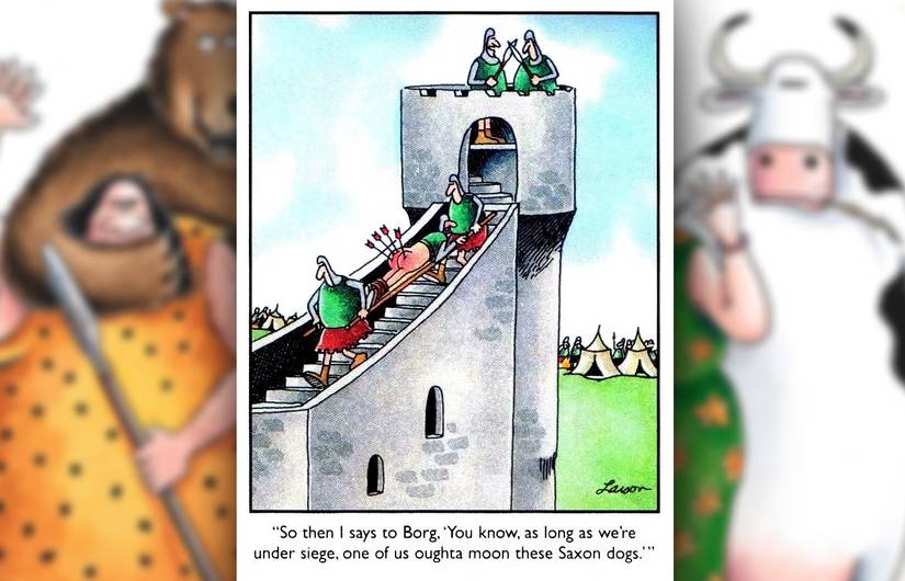 En esta franja, un grupo de soldados medievales se dan cuenta rápidamente de que sus uniformes (presumiblemente descuentos) con grandes objetivos rojos son una idea terrible al intentar asaltar un castillo lleno de arqueros. Es relativamente raro que Lado lejano En realidad, muestra a cualquiera que se lesione (Larson prefiere el momento justo antes o después), pero aquí se muestran a varios soldados que son golpeados justo en la diana. Los uniformes podrían haber sido una gran idea si los objetivos se centraron en áreas inofensivas, en lugar de estar en el centro de los órganos vitales de los soldados.