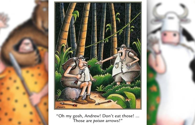 En esta franja, se debe advertir a un explorador despistado comiendo algunas flechas que encontró en el suelo, ya que están cubiertas de una sustancia letal. El cómic depende de un juego de palabras inteligente, la diferencia entre ‘venenoso’ y ‘venenoso’. Técnicamente, el término ‘venenoso’ se refiere a sustancias que son dañinas cuando se ingieren, mientras que ‘venenoso’ trata específicamente con el veneno animal. Es un “hecho divertido” popular que relativamente pocos tipos de serpientes son literalmente “venenosos”, a pesar de que muchos más son “venenosos”.