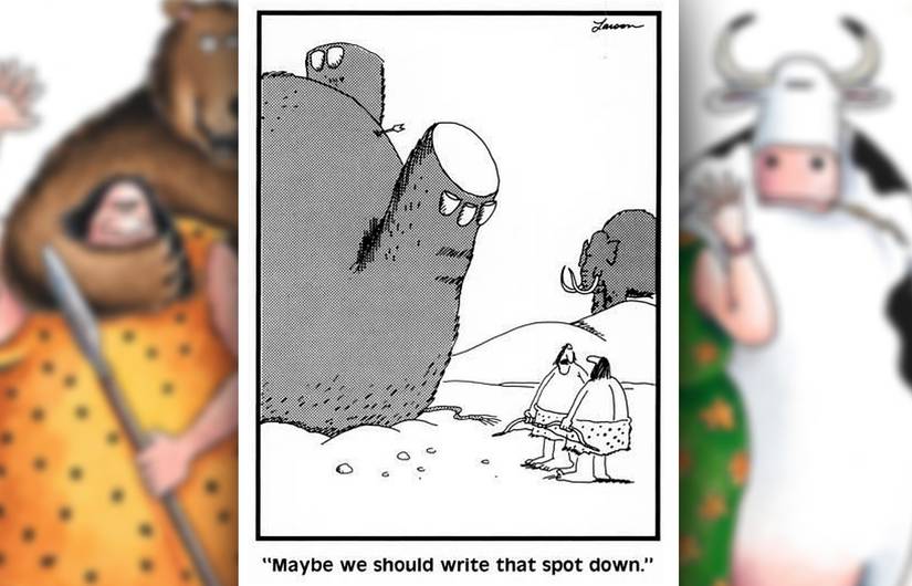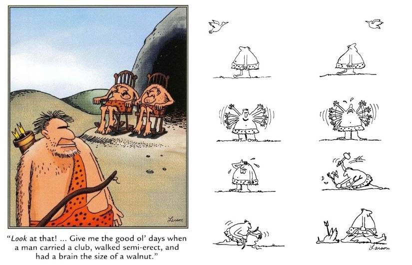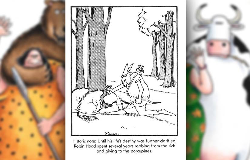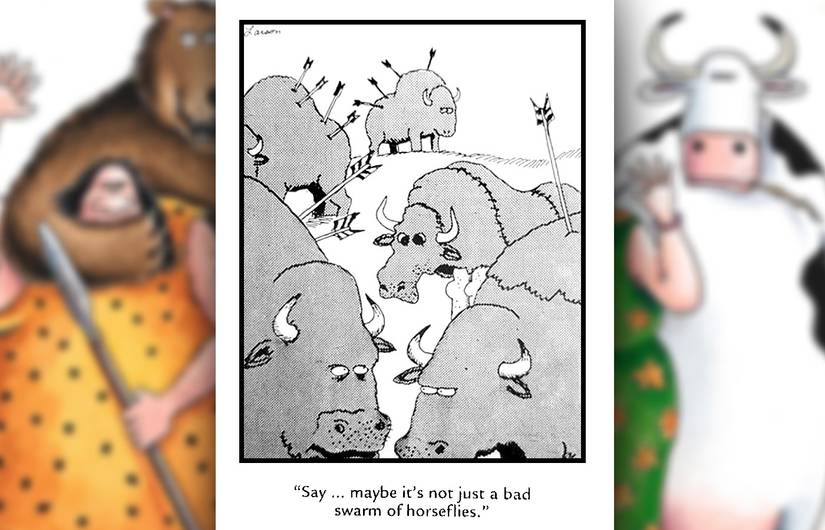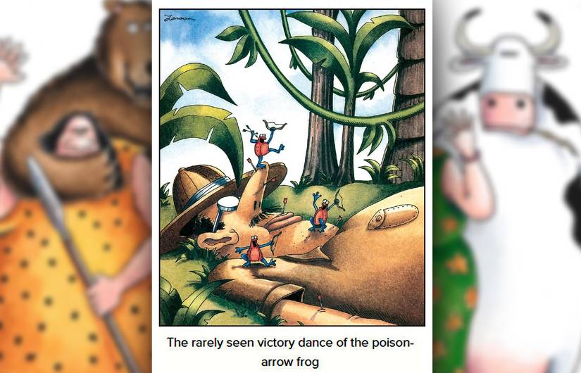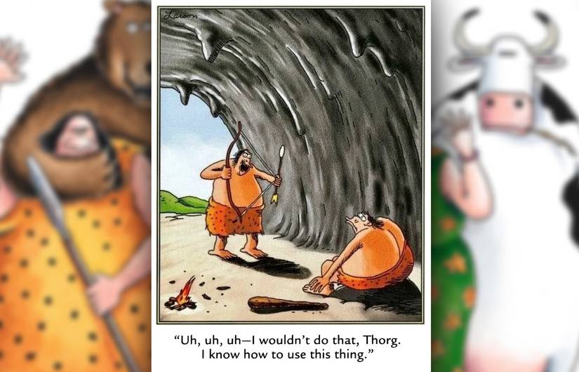 En esta franja, un hombre de las cavernas amenaza a un rival con un arco y una flecha que el 100% no sabe usar, a pesar de sus afirmaciones de lo contrario. Siempre es divertido ver a alguien absolutamente confiado en sus habilidades cuando no tiene ni idea, y la visual de alguien que señala un arco en la dirección equivocada es particularmente divertido. Larson tiene múltiples cómics que combinan a los hombres de las cavernas y el tiro con arco, desde viejas cavernas gruñones quejándose de inventos novedosos hasta una franja sombría de múltiples paneles donde un hombre de las cavernas se esfuerza por volar con las aves, solo para conformarse con dispararlos.