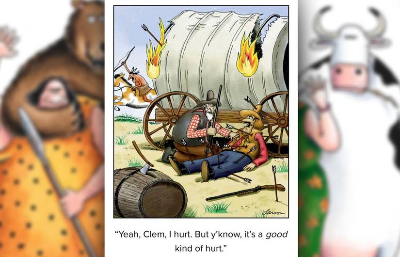 En esta franja, dos granizadores están indignados al darse cuenta de que sus atacantes encienden sus flechas en llamas. Larson se especializa en presentar reacciones mundanas a situaciones extremas, y este es un ejemplo perfecto. A pesar de ser atacada con armas mortales, con sus vagones ardiendo a su alrededor, a los hogares se preocupan principalmente por si sus atacantes están permitido para adoptar esta innovación ardiente. Como perspectiva, es un poco rico de las personas que llevaron la pólvora a una pelea de arco y flecha.